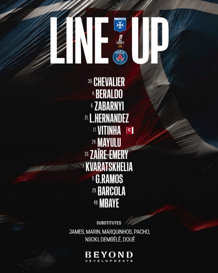 巴黎圣日耳曼首发:30-舍瓦利耶、4-贝拉尔多、6-扎巴尔尼、21-卢卡斯·埃尔南德斯、17-维蒂尼亚、24-马尤卢、33-扎伊尔·埃梅里、7-克瓦拉茨赫利亚、9-贡萨洛·拉莫斯、29-巴尔科拉、49-姆巴耶
